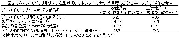 もろみのpHが低下した後に蒸したジャガイモを添加することにより、アントシアニン量および製品の着色度を高めることができる。また製品はDPPHラジカル消去活性(抗酸化活性の指標)を有する(表2)。