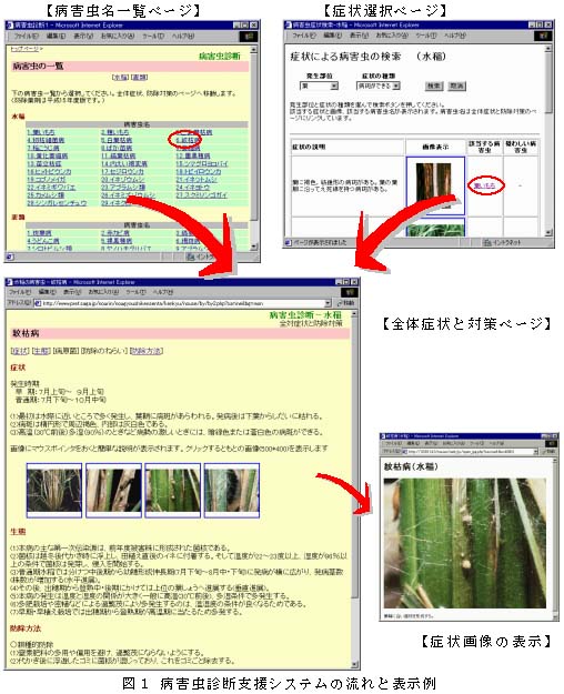 このシステムにおける病害虫の診断は、病害虫名の一覧から病害虫を選択する方法と、病害虫の発生部位と症状の種類を選択して該当する可能性の高い病害虫の一覧を表示し、そのリンクをたどる方法がある(図1)。