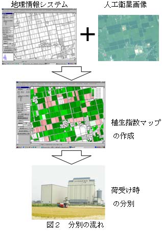 この関係を用いることで、人工衛星画像から各圃場をタンパク質含量に基づいて格付けする事ができ、荷受け時に効率的に分別できる(図2)。