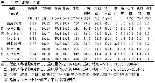 - 水稲「西海250号」は、「かりの舞」に比べ出穂期で4日、成熟期で7日早い中生の晩である。稈長がやや長く耐倒伏性はやや弱いが、千粒重が重く収量性が高い。玄米の外観品質も優れ、食味は「ヒノヒカリ」並の良食味である。