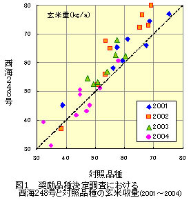 図1 奨励品種決定調査における西海248号と対照品種の玄米収量(2001〜2004)