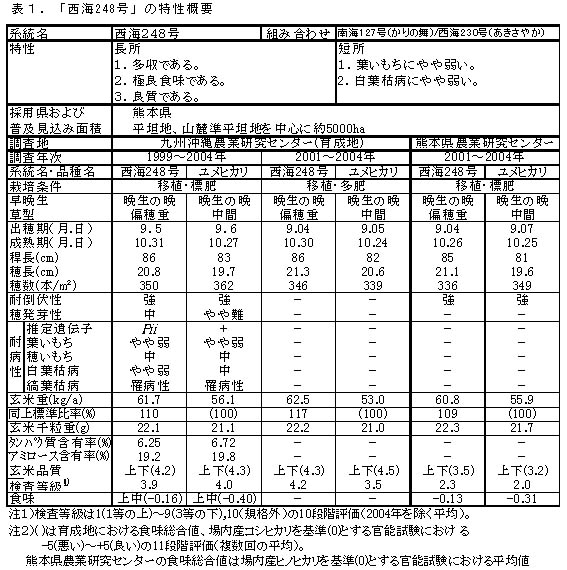 - 「西海248号」は、「ユメヒカリ」熟期の晩生の粳種である。強稈で耐倒伏性に優れ、収量性は「ユメヒカリ」「かりの舞」を約10%上回る多収である。食味は「ユメヒカリ」に明らかに優る極良食味である。「ユメヒカリ」等の代替として熊本県で普及予定である。