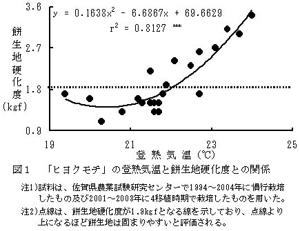 「ヒヨクモチ」の餅生地硬化度は、登熟気温(出穂期から収穫前日までの平均気温)が高いほど大きい。実需者が「ヒヨクモチ」に求める餅生地硬化度は1.9kgf未満であることから、その生育条件は登熟気温が摂氏22度以下の場合と推定される(図1)。