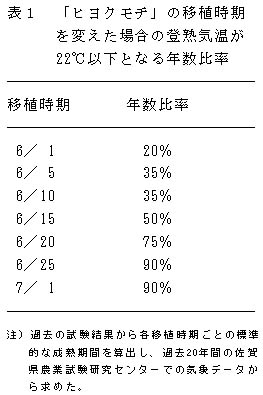 表1 「ヒヨクモチ」の移植時期を変えた場合の登熟気温が摂氏22度以下となる年数比率