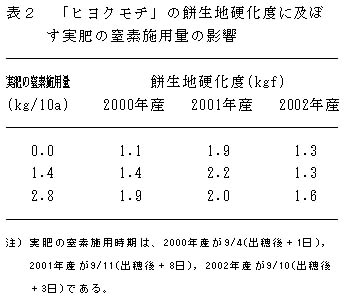「ヒヨクモチ」の餅生地硬化度は実肥の窒素施肥量が多いほど大きくなるため、過度な施肥とならないよう佐賀県施肥基準に従って施肥管理を適切に行う(表2)。