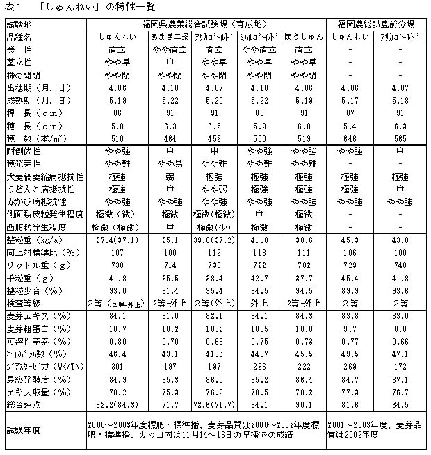 - ビール大麦新品種「しゅんれい」は、側面裂皮粒と凸腹粒の発生が少なく、多収で早播適応性を有する。オオムギ縞萎縮ウイルスI型系統とうどんこ病に抵抗性で外観品質とビール醸造品質が優れる。福岡県で準奨励品種に採用。