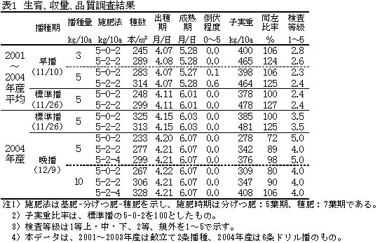 窒素施肥法は早播(11/10〜20)、標準播(11/21〜30)、晩播(12/1〜10)ともに収量確保の点から、基肥5kg/10a、分げつ肥2kg/10a、穂肥2kg/10aが適し、倒伏等の問題はなく、外観品質も良好である(表1)。