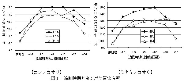 醤油醸造用として必要とされるタンパク質含有率13%を安定的に確保できる追肥時期は「ニシノカオリ」で出穂期〜出穂後10日、「ミナミノカオリ」で出穂後5〜10日である(図1、表1)。