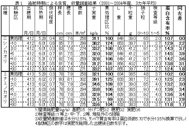 表1 追肥時期による生育、収量調査結果(2001〜2004年産、3カ年平均)