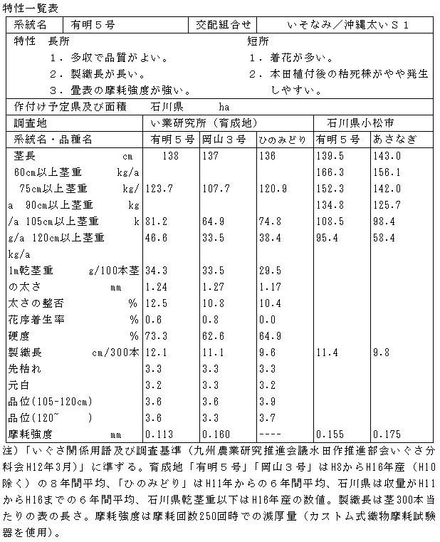 - いぐさ「有明5号」は茎の硬さが硬く、製織長が長い。畳表の品質が良くかつ摩耗強度が強く丈夫な畳表が製織できる。