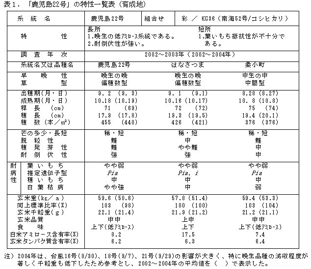 表1 「鹿児島22号」の特性一覧表(育成地)