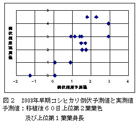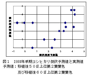 図1 2003年早期コシヒカリ倒伏予測値と実測値