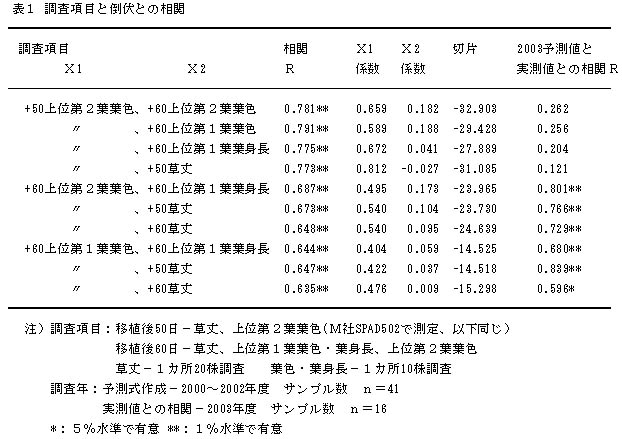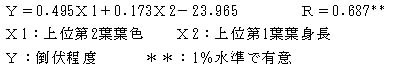 2000〜2002年の調査項目2項目の組み合わせから倒伏程度の予測式を重回帰で作成すると、X1に移植後50日上位第2葉葉色の調査項目が含まれる予測式が相関係数が最も高く、次いで移植後60日上位第2葉葉色であった。(表1)