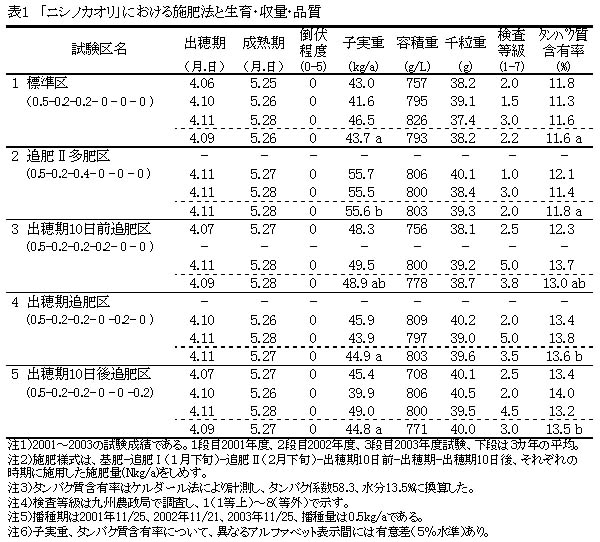表1 「ニシノカオリ」における施肥法と生育・収量・品質
