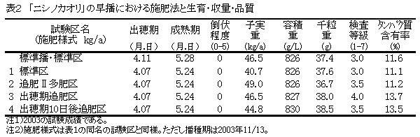 表2 「ニシノカオリ」の早播における施肥法と生育・収量・品質