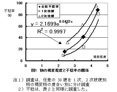 - 図1 籾の褐変程度と不稔率の関係