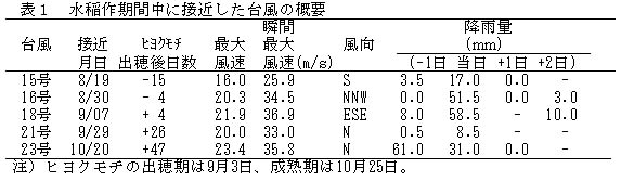 表1 水稲作期間中に接近した台風の概要
