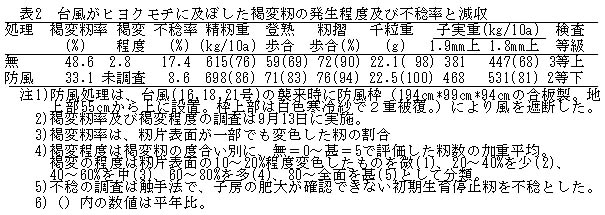表2 台風がヒヨクモチに及ぼした褐変籾の発生程度及び不稔率と減収