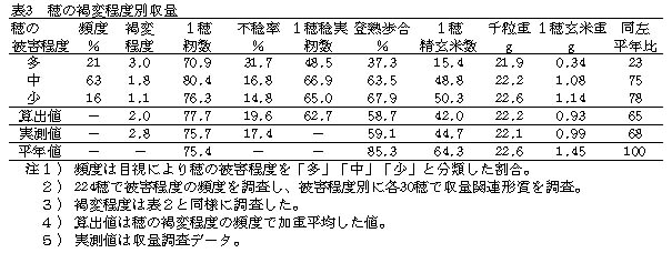 籾の褐変状況から区分した穂の被害程度と減収の関係は「多(褐変程度3.0)」では77%、「中(褐変程度1.8)」では25%、「少(褐変程度1.1)」では22%の減収となり、穂の褐変程度とその頻度で、減収程度が推定できる(表3)。