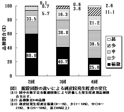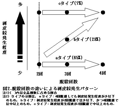 脱穀回数を変えると、品種の剥皮粒発生程度は、回数に関係なく剥皮の発生が安定して少ないもの(aタイプ)、回数が増えるにしたがって剥皮の増加するもの(bタイプ)および回数が少ない段階から剥皮の多いもの(cタイプ)の3つに分類でき(図2)、aタイプを選抜することにより剥皮粒抵抗性系統の育成が可能である。