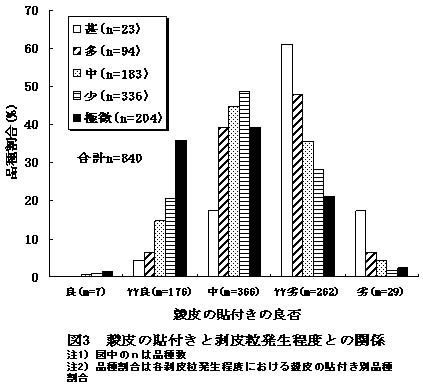 穀皮の貼付きの良い品種では、剥皮粒の発生が少ない傾向にある(図3)。