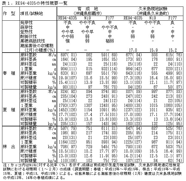 「RK94-4035」は、早期高糖性で主要病害に対して抵抗性を具える「NiF8」を母本に、多収性品種の「Ni9」を父本に用い、1993年に交配して得た実生から、耐風性、耐病性、安定多収を育種目標として、選抜、育成した系統である。