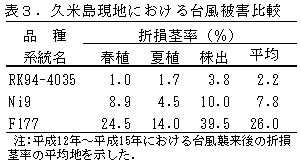 - 沖縄県久米島において、比較的肥沃な土壌では、脱葉性が良く立茎で手刈収穫が容易な「F177」が多く栽培され、保水力が弱くて干ばつ害が生じやすい圃場では「Ni9」が栽培されている。しかし「F177」は、萌芽が不安定で株出収量が低く、「Ni9」は黒穂病被害の拡大が問題となっている。さらに両品種共に、台風襲来時は茎の折損が多いため低収量であり、潮風害により収穫期の糖度が低くなる場合が多い。平成15年には台風被害が少なくて、株出収量の多い「Ni17」の普及が始められたが、同品種は黒穂病に弱く、保水力が弱い土壌では生育が劣るため、「Ni9」が栽培されている地域での普及には適さない。このため台風害に強く、黒穂病抵抗性を具え、高糖度で安定多収な品種が強く求められている。