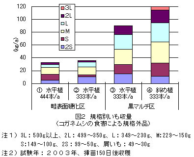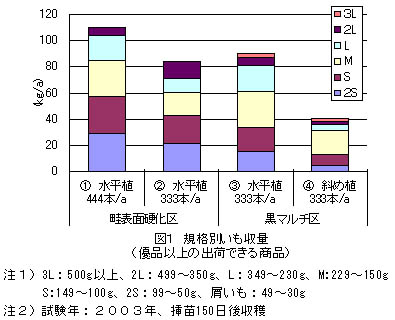 - 畦表面硬化機(野菜畦用)を用いて、カンショ「高系14号」を密植水平植栽培すると、慣行の黒マルチ・斜植に比較して、青果用に適するL〜2Sの割合が多く、コガネムシによる食害が少なく、優品以上のいも収量が増加する。