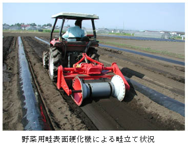 野菜用畦表面硬化機を利用して青果用カンショ「高系14号」を栽培すると、慣行の黒マルチ・斜植栽培法に比較し、下記の有利性がみられる。