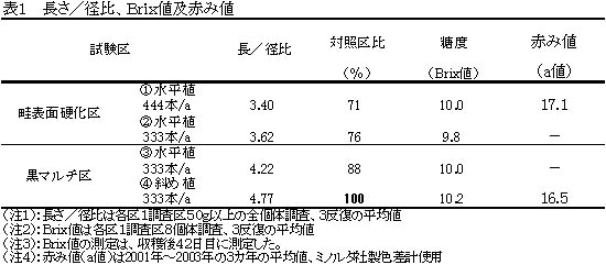 いもの長/径比はやや小さくなるが、生いもの糖度(Brix値)は同程度である(表1)。