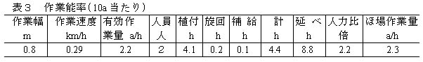作業能率は4.4h/10a(延べ8.8h/10a)で、人力植付作業に比べ2.2倍の能率向上と軽作業化が図られる(表3)。
