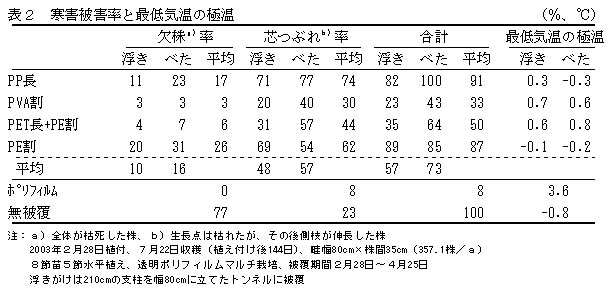 被覆期間中の最低気温の極温は、資材間ではPVA割、PET長+PE割が高く、低いものは摂氏0度を下回った。寒害の被害率は、PVA割、PET長+PE割で低く、いずれもべたがけより浮きがけで低かった(表2)。