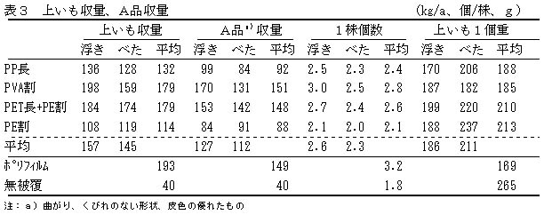 上いも収量は、ポリフィルムより劣るものの、PVA割、PET長+PE割が高くポリフィルムとの差は小さい。A品収量も、上いも収量と同様の傾向にある(表3)。被覆方法では、浮きがけがべたがけより高い傾向にある。