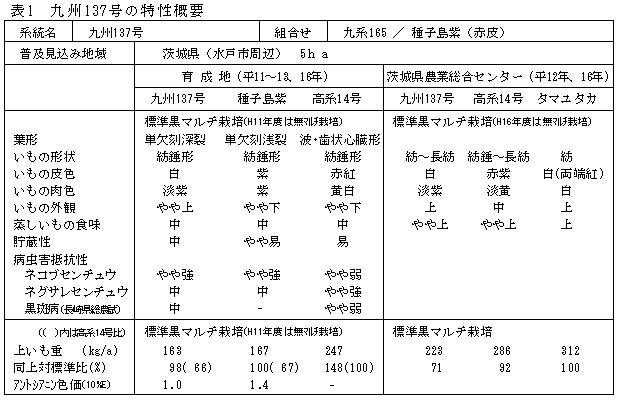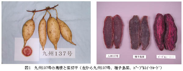 「九州137号」は、平成6年にいもの外観が優れる紫カンショ系統「九系165」を母、赤皮で食味がよい紫肉の在来品種「種子島紫」を父として交配し選抜した系統である。