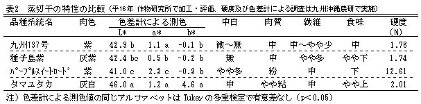表2 蒸切干の特性の比較(平16年作物研究所で加工・評価、硬度及び色差計による調査は九州沖縄農研で実施)