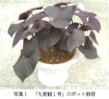 - カンショ「九育観1号」は、茎葉が濃い紫色で、葉形が心臓形という特徴を持つ。露地植え、プランター植えなど観賞用として利用できる。