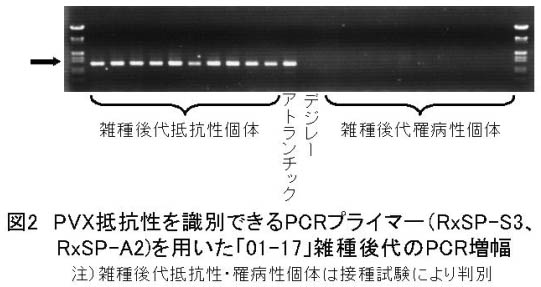 図2 PVX抵抗性を識別できるPCRプライマー(RxSp-S3、RxSP-A2)を用いた「01-17」雑種後代のPCR増幅