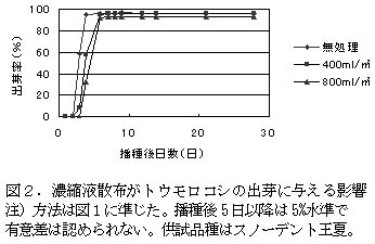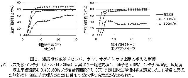 - 濃縮液を800ml/m2散布するとイネ科雑草のメヒシバ、広葉雑草のホソアオゲイトウの出芽が遅れ28日後の生存個体数も無処理に比べ少なくなる(図1)。