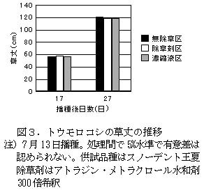 - 圃場において夏作トウモロコシ播種後、濃縮液を800ml/m2散布すると、播種後27日までのトウモロコシの草丈に差は見られない(図3)。一方、播種後約1ヶ月の雑草数、雑草乾物重は無除草区に比べ広葉雑草が減少する。よりも減少する。(図4)。