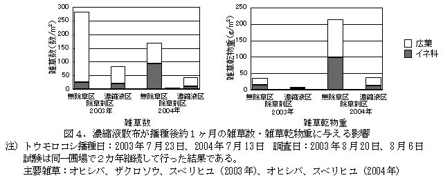 図4 濃縮液散布が播種後約1ヶ月の雑草数・雑草乾物重に与える影響