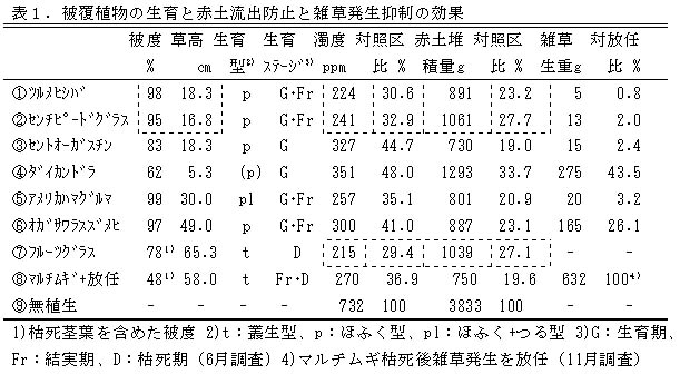 表1 被覆植物の生育と赤土流出防止と雑草発生抑制の効果