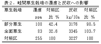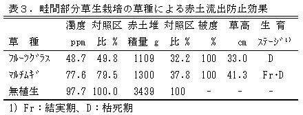表3 畦間部分草生栽培の草種による赤土流出防止効果