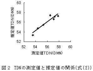 TDNは細胞内容物質(OCC)、高消化性繊維(Oa)及び低消化性繊維(Ob)含量を変数とした重回帰式により、精度良く推定できる(表2(2)式、図2)。また、推定精度は若干劣るが、NDF(中性デタージェント繊維)含量を変数とした一次回帰式を用いても推定できる(表2(3)式)。