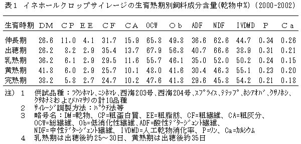 表1 イネホールクロップサイレージの生育熟期別飼料成分含量(乾物中%)(2000-2002)