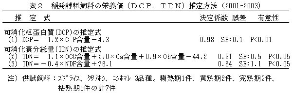 表2 稲発酵粗飼料の栄養価(DCP、TDN)推定方法(2001-2003)
