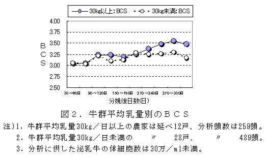 給与飼料の成分は、農家調査において個体毎の飼料給与量を実測(一部聞き取り)し、日本標準飼料成分表(1995、2001)及び近赤外分析結果(粗飼料)に基づき算出した。乳量および繁殖成績は牛群検定成績による。