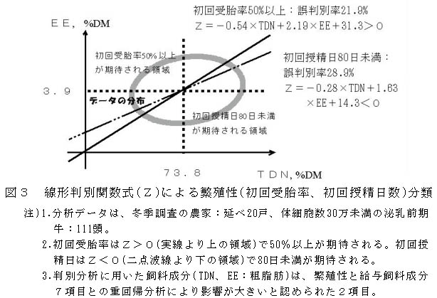 繁殖性に関する判別分析結果から、初回授精日数80日未満が期待できるTDN含量とEE含量の飼料設計例はそれぞれ約74%以上、3.9%以下である(図3)。
