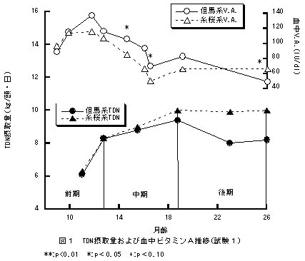 但馬系は糸桜系よりビタミンA製剤無添加の飼料を給与する中期の血中ビタミンA量の低下が遅い(図1)。