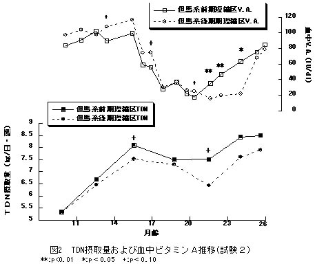 図2 TDN摂取量および血中ビタミンA推移(試験2)