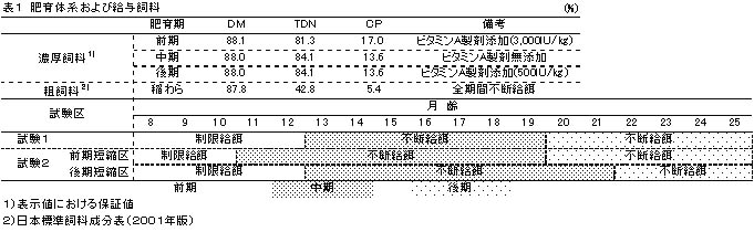 試験2(平成14〜15年度):父系統が但馬系同一種雄牛の交雑種去勢牛8頭を用い、試験1より肥育中期を2ヶ月延長した前期短縮区(肥育中期:10〜19ヶ月齢)4頭、後期短縮区(肥育中期:12〜21ヶ月齢)4頭を比較した(表1)。